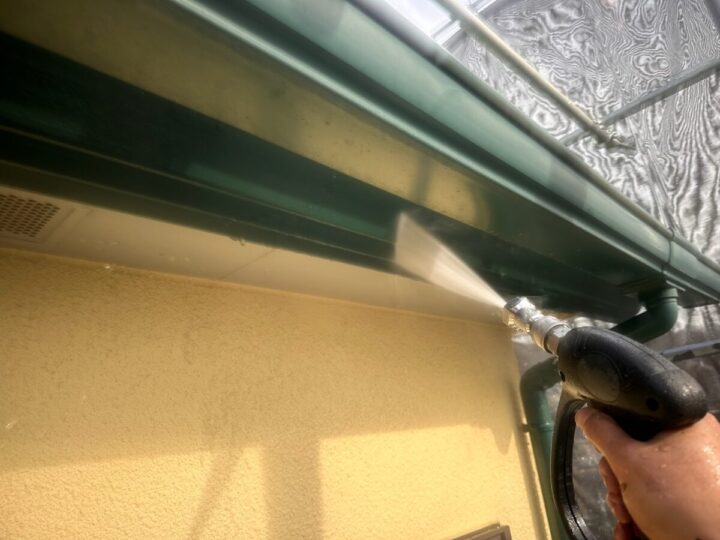 付着した雨跡・コケ・カビなどの汚れをきれいに洗い流します。汚れたままだと良い塗料を塗っても、すぐに浮いてきたり剥がれたりの原因になるからです。