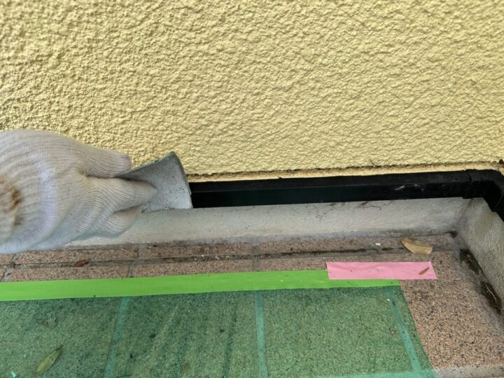外壁に下塗りをしています。上からの塗料をしっかり密着させるために、下地をしっかり調整していきます。