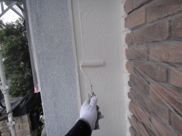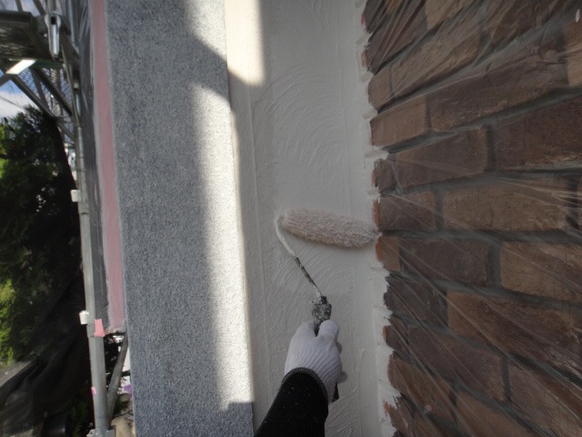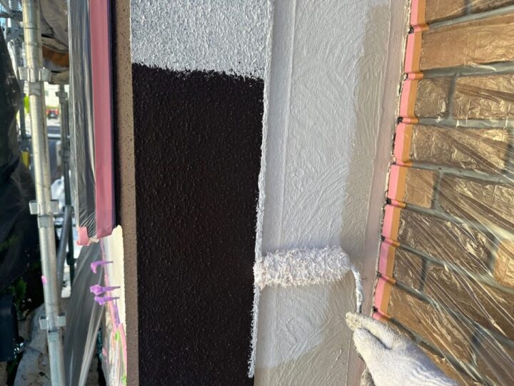 外壁に下塗りをしています。上からの塗料をしっかり密着させるために、下地をしっかり調整していきます。