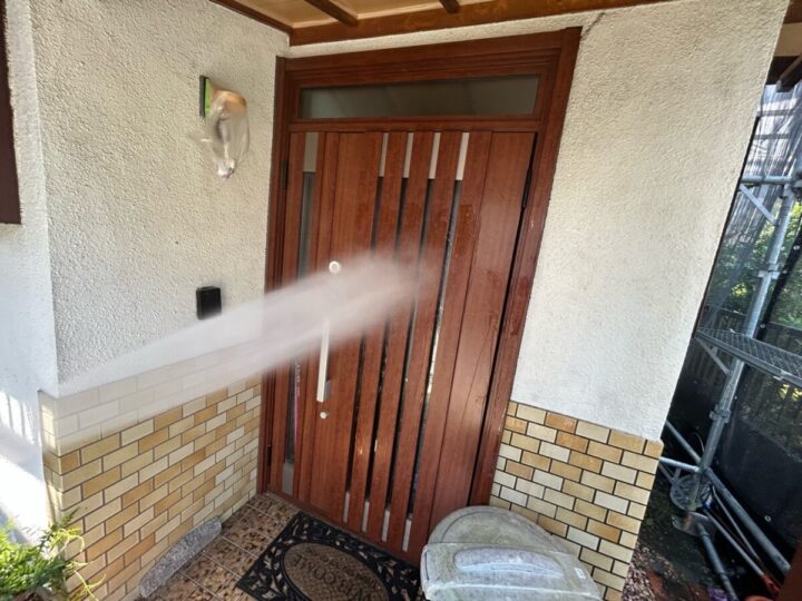 付着した雨跡・汚れをきれいに洗い流します。玄関ドア 高圧洗浄