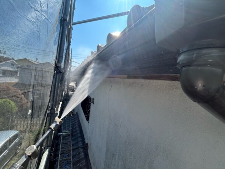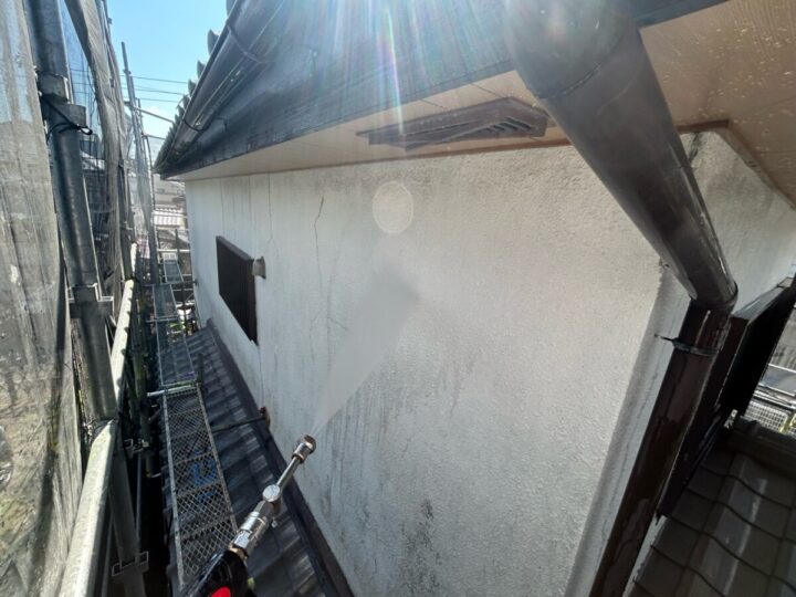 付着した雨跡・コケ・カビなどの汚れをきれいに洗い流します。汚れたままだと良い塗料を塗っても、すぐに浮いてきたり剥がれたりの原因になるからです。外壁 高圧洗浄