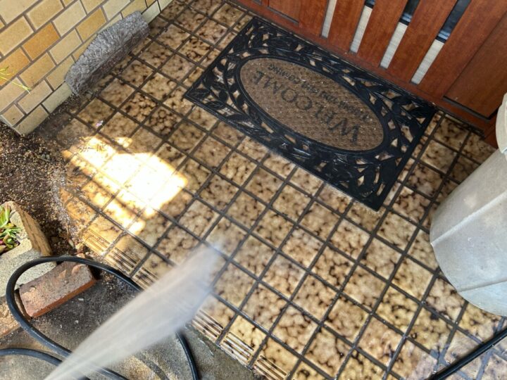 付着した雨跡・コケ・カビなどの汚れをきれいに洗い流します。汚れたままだと良い塗料を塗っても、すぐに浮いてきたり剥がれたりの原因になるからです。玄関タイル 高圧洗浄