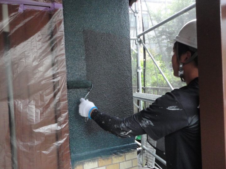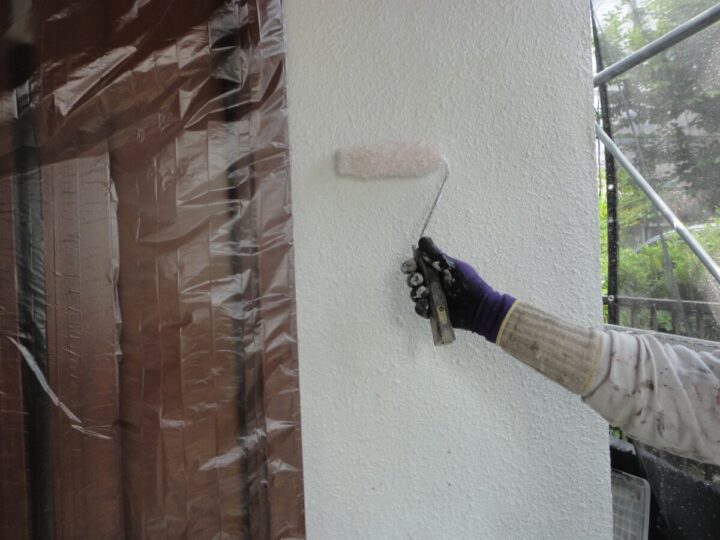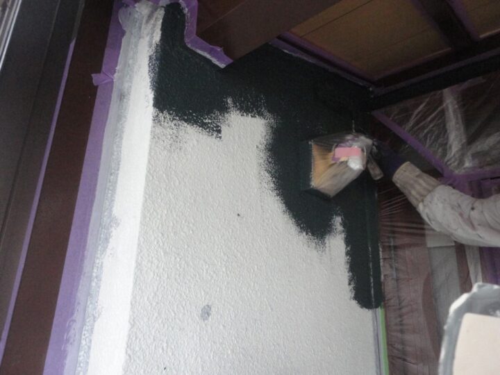 外壁に下塗りをしています。上からの塗料をしっかり密着させるために、下地をしっかり調整していきます。外壁 中塗り