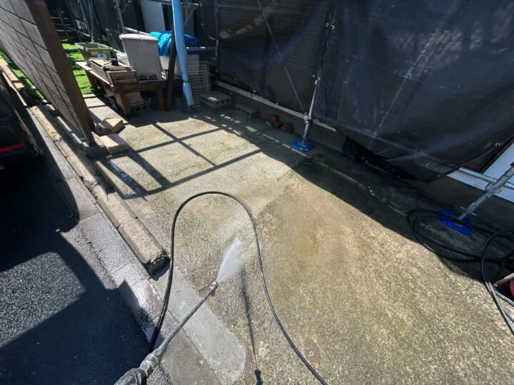 付着した雨跡・コケ・カビなどの汚れをきれいに洗い流します。土間 高圧洗浄