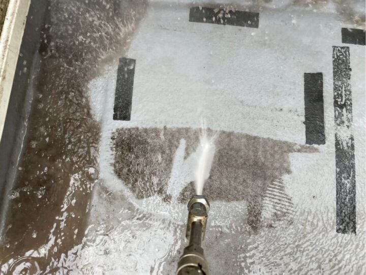 付着した雨跡・コケ・カビなどの汚れをきれいに洗い流します。汚れたままだと良い塗料を塗っても、すぐに浮いてきたり剥がれたりの原因になるからです。バルコニー 高圧洗浄