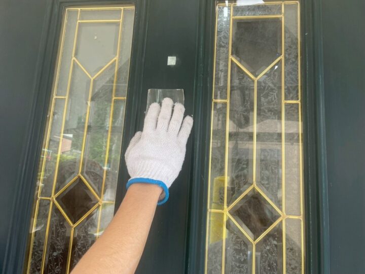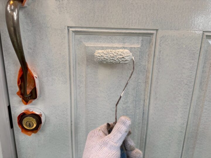 外壁に下塗りをしています。上からの塗料をしっかり密着させるために、下地をしっかり調整していきます。玄関扉 中塗り