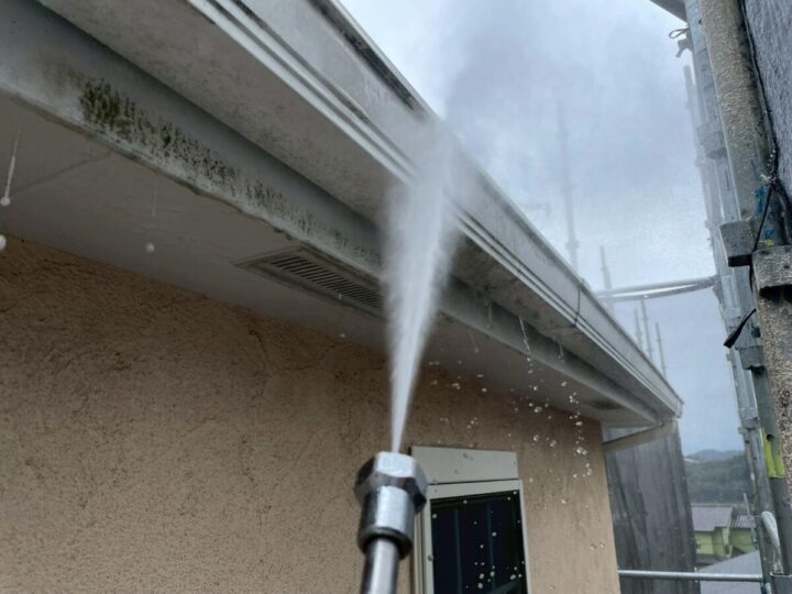 付着した雨跡・コケ・カビなどの汚れをきれいに洗い流します。汚れたままだと良い塗料を塗っても、すぐに浮いてきたり剥がれたりの原因になるからです。幕板付け梁 高圧洗浄