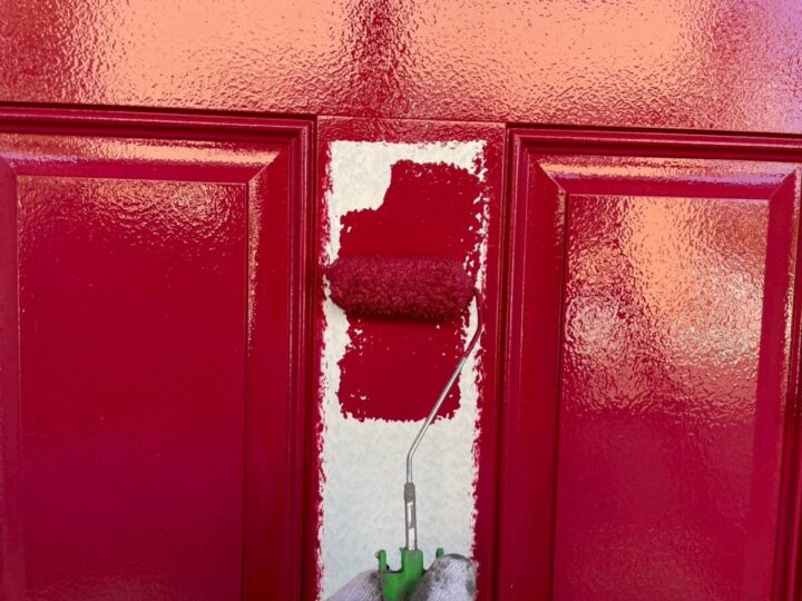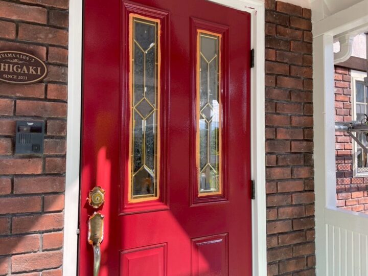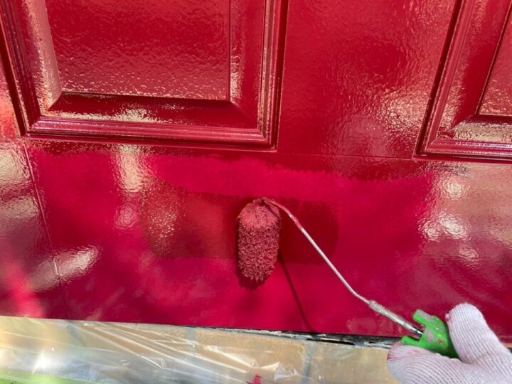 中塗りに使用した塗料で、上塗りを行います。2回塗ることで適切な膜厚を確保します。玄関扉終了
