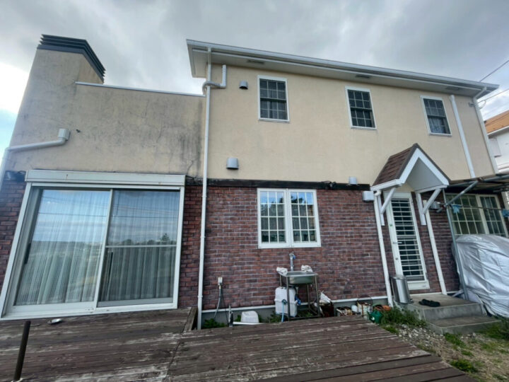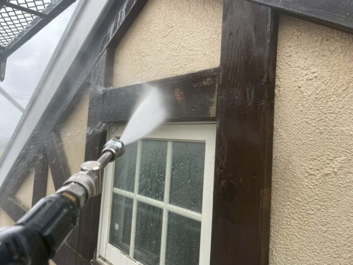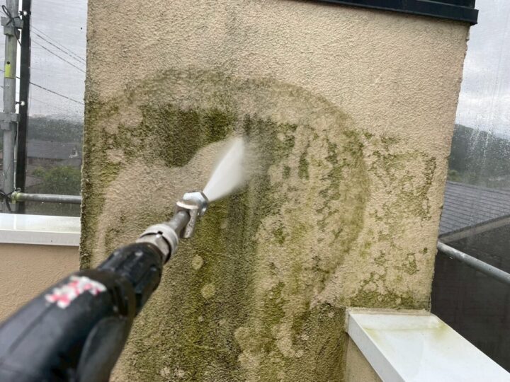 付着した雨跡・コケ・カビなどの汚れをきれいに洗い流します。汚れたままだと良い塗料を塗っても、すぐに浮いてきたり剥がれたりの原因になるからです。外壁 高圧洗浄