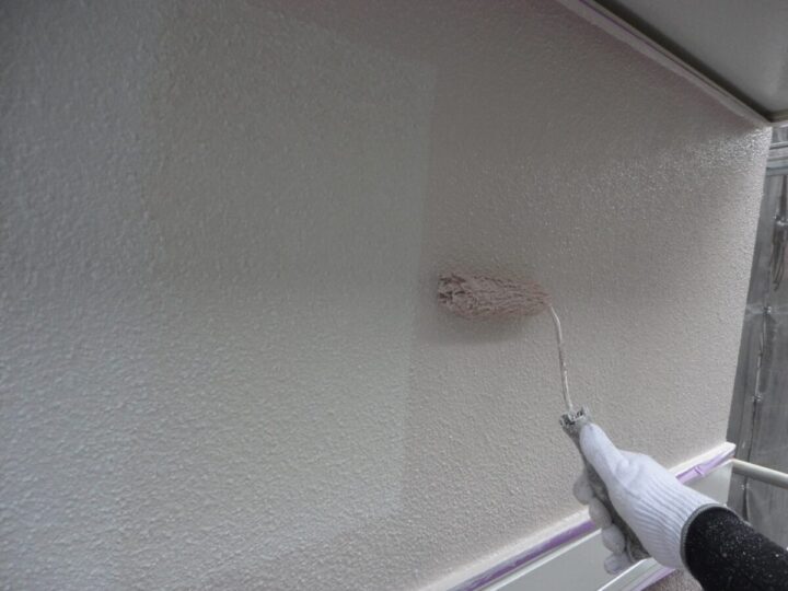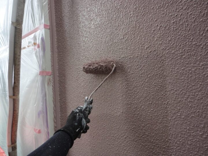 外壁に下塗りをしています。上からの塗料をしっかり密着させるために、下地をしっかり調整していきます。外壁 中塗り(ベビーピンク)