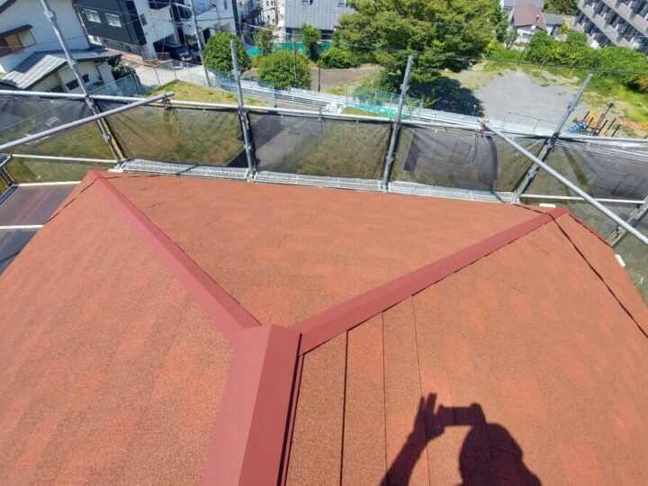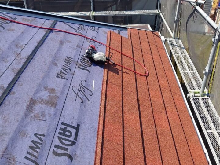 屋根を雨漏りから守るルーフィングシート(防水シート)の上から断熱材が使用された軽量金属屋根を板金工が張り付けていきます。屋根 カバー工事