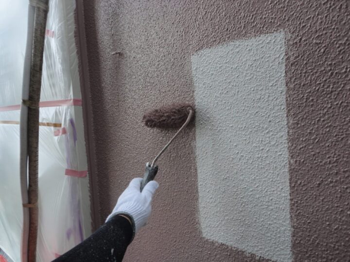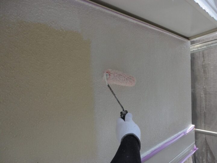 中塗りに使用した塗料で、上塗りを行います。2回塗ることで適切な膜厚を確保します。下塗りと比べると、違いがよく分かります。外壁 中塗り(ローズベージュ)