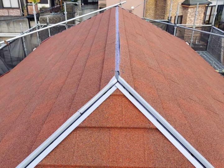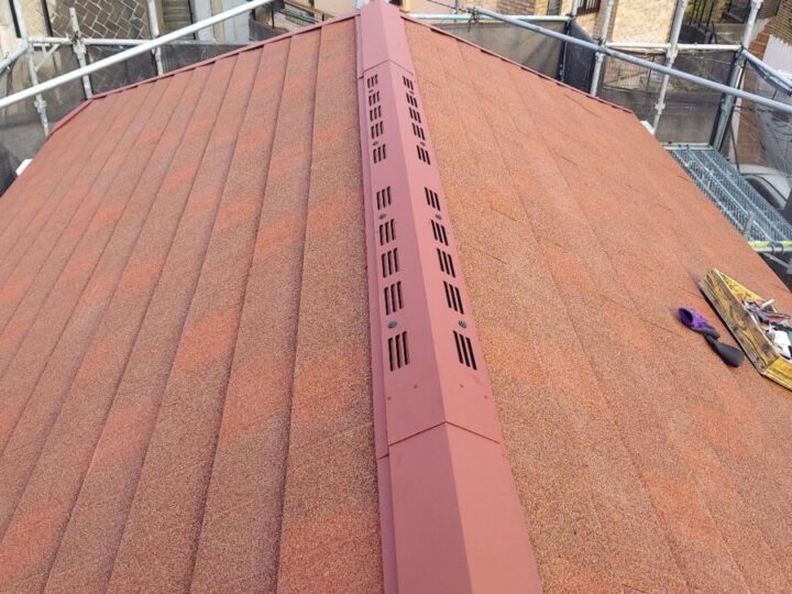 貫板の上から新しい棟板金を張り付けていきます。屋根 カバー工事