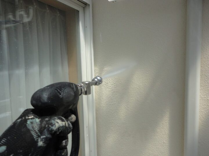 付着した雨跡・コケ・カビなどの汚れをきれいに洗い流します。。汚れたままだと良い塗料を塗っても、すぐに浮いてきたり剥がれたりの原因になるからです。外壁 洗浄