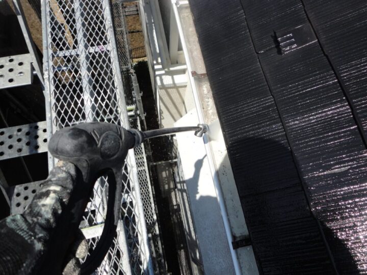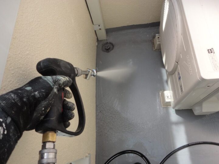 付着した雨跡・コケ・カビなどの汚れをきれいに洗い流します。。汚れたままだと良い塗料を塗っても、すぐに浮いてきたり剥がれたりの原因になるからです。バルコニー 洗浄