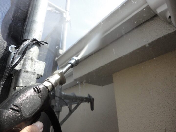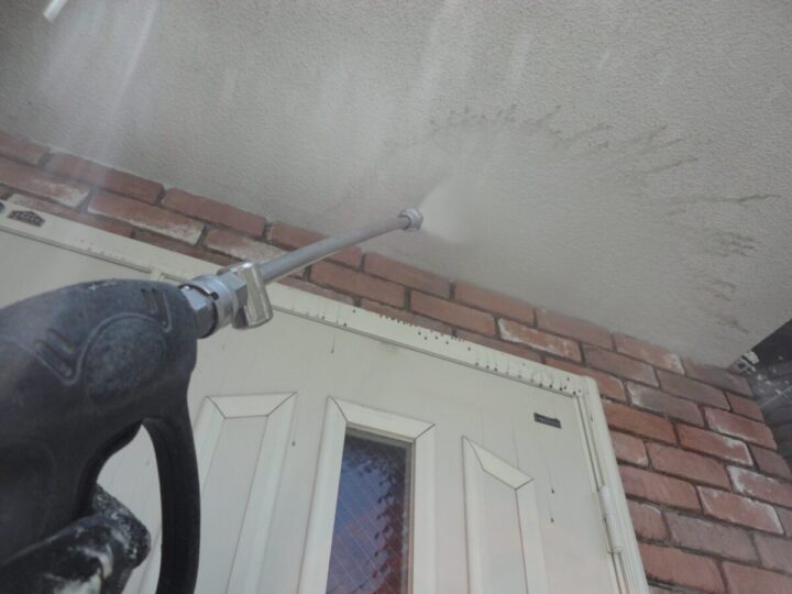 付着した雨跡・コケ・カビなどの汚れをきれいに洗い流します。。汚れたままだと良い塗料を塗っても、すぐに浮いてきたり剥がれたりの原因になるからです。軒天 洗浄