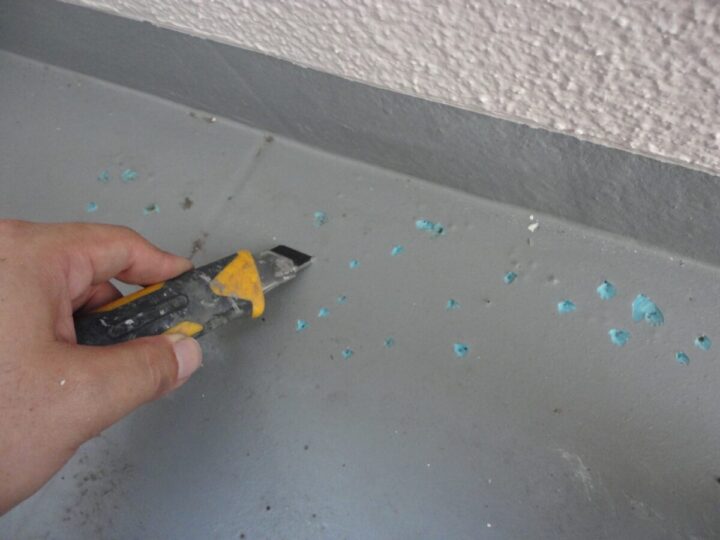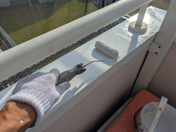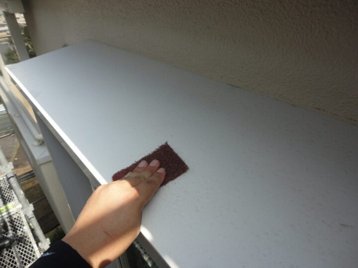 塗装面についた古い塗膜やサビを除去。キレイに塗料でコーティングするために重要です。バルコニー 上塗り