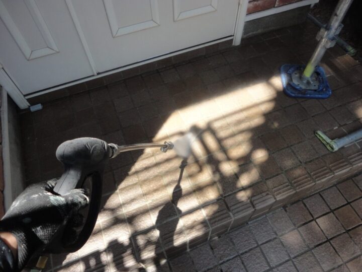 付着した雨跡・コケ・カビなどの汚れをきれいに洗い流します。。汚れたままだと良い塗料を塗っても、すぐに浮いてきたり剥がれたりの原因になるからです。玄関タイル 洗浄