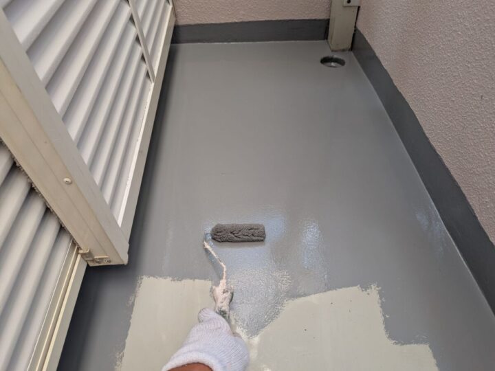 バルコニーに下塗り、中塗り、上塗りをします。外壁・付帯部 施工完了