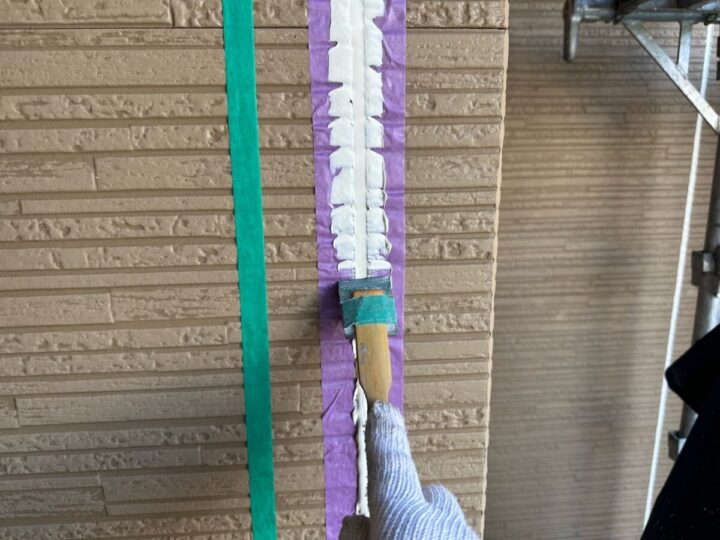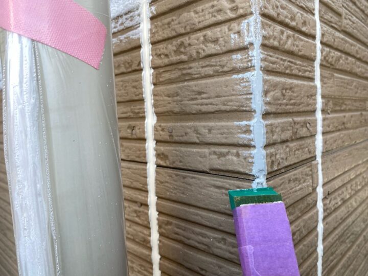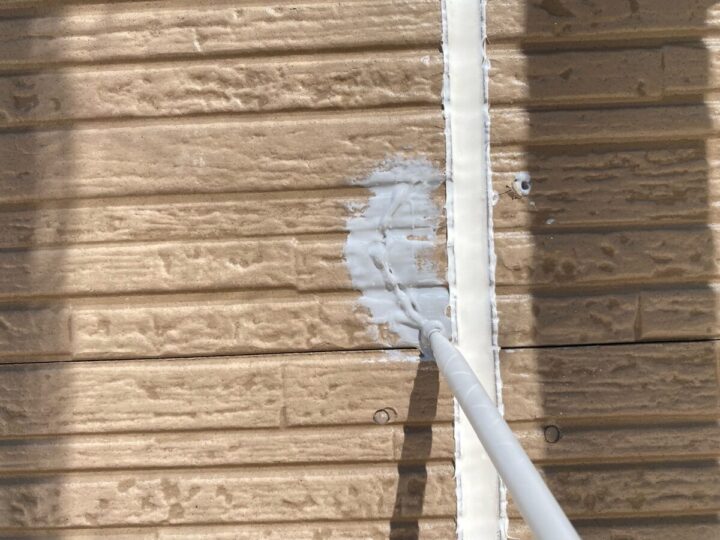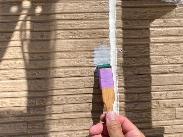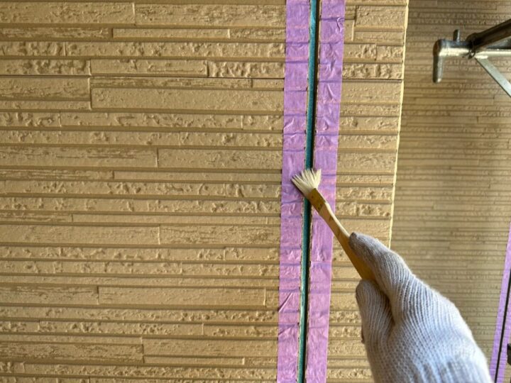 劣化していた外壁の目地コーキング(シーリング)を撤去後、新しいコーキング材をしっかり密着するために接着剤の役割をしてくれるプライマーを刷毛で塗り込んでいきます。外壁 シーリング打設