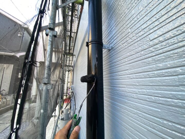 破風も下塗り、中塗り、上塗りをします。ドレン管 上塗り