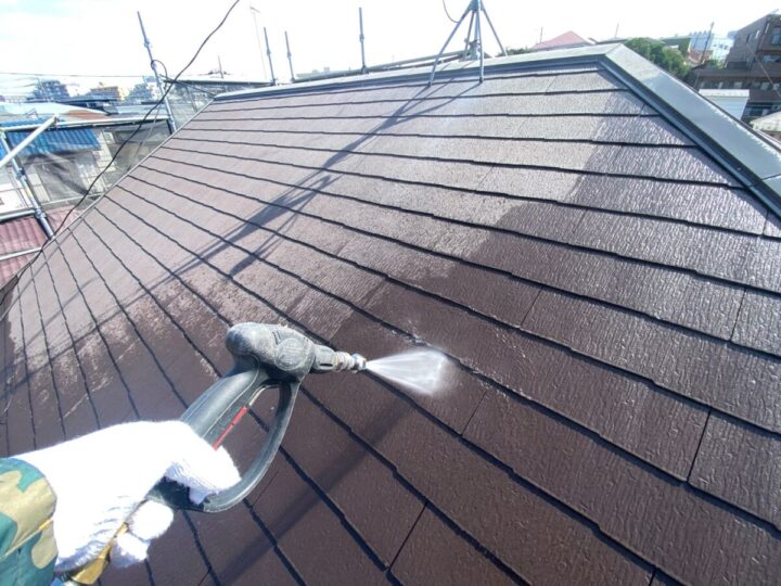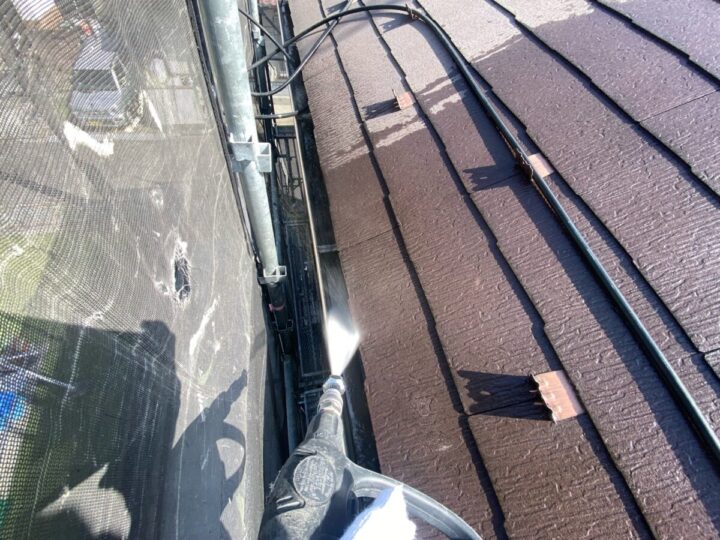 付着した雨跡・コケ・カビなどの汚れをきれいに洗い流します。棟板金 ケレン