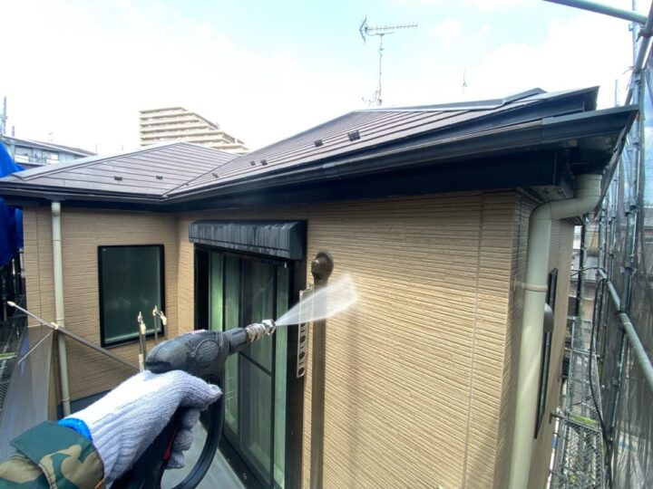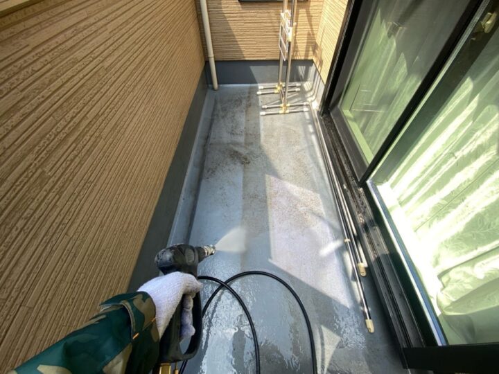 付着した雨跡・コケ・カビなどの汚れをきれいに洗い流します。汚れたままだと良い塗料を塗っても、すぐに浮いてきたり剥がれたりの原因になるからです。バルコニー 高圧洗浄