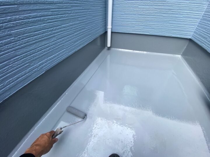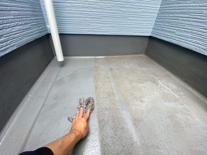 バルコニーも下塗り、中塗り、上塗りをします。施工完了