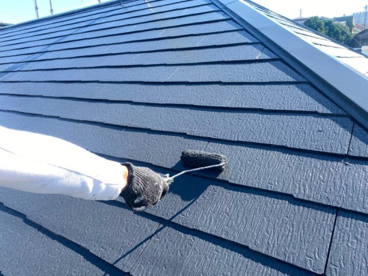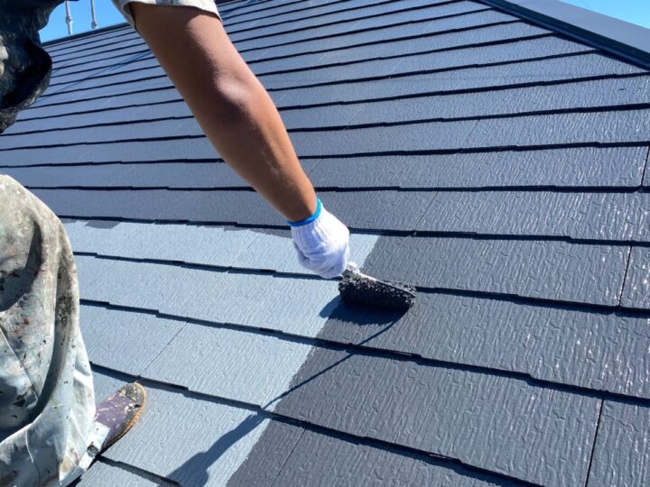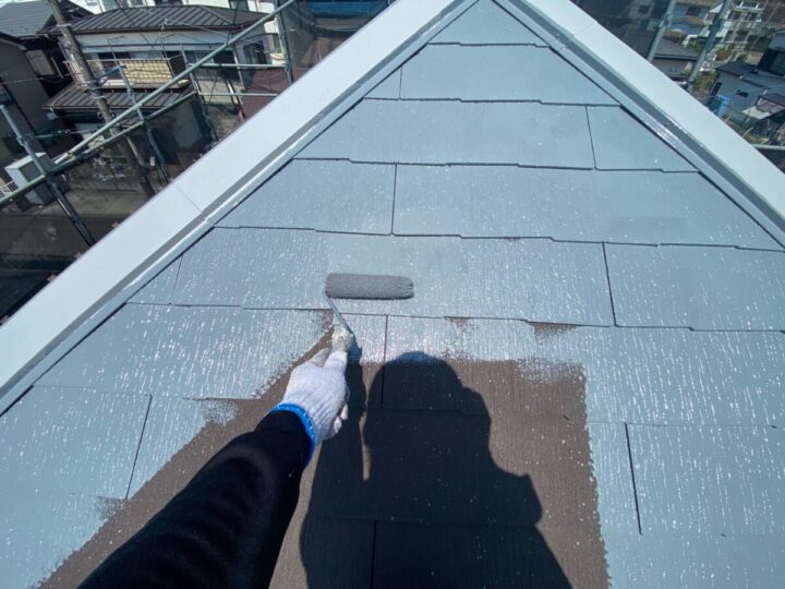 屋根に下塗りをしています。上からの塗料をしっかり密着させるために、下地をしっかり調整していきます。屋根 中塗り(カーボングレー)