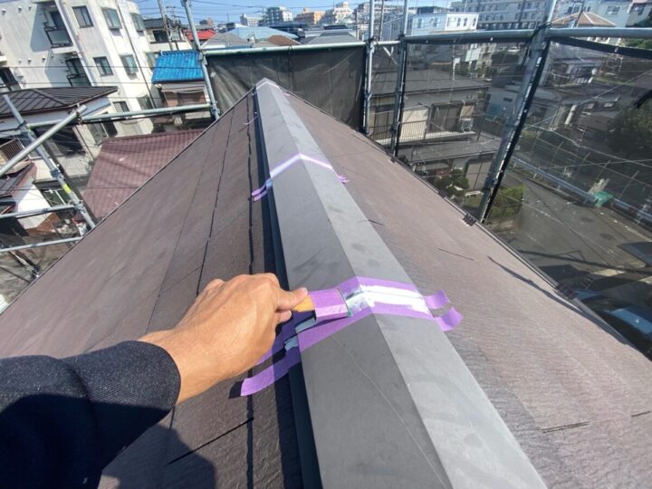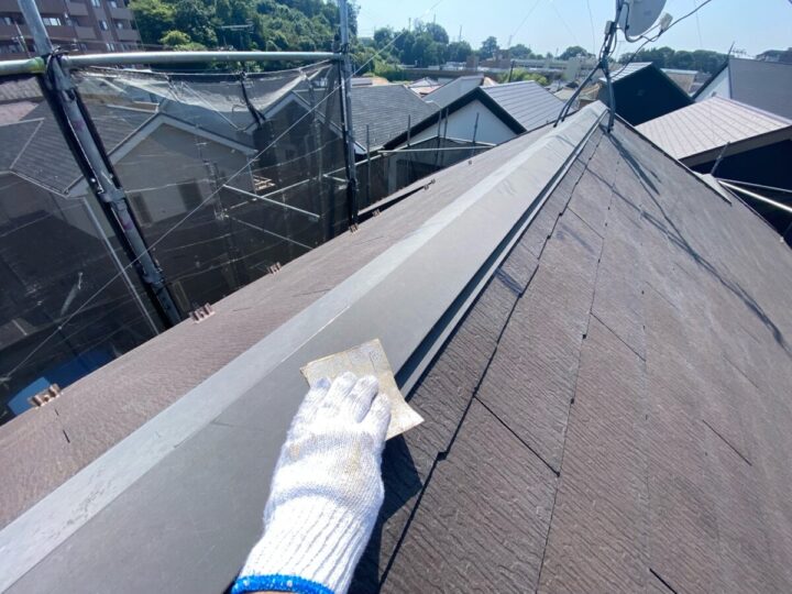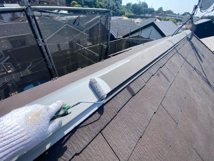 棟板金に錆止めの下塗りをします。屋根 下塗り