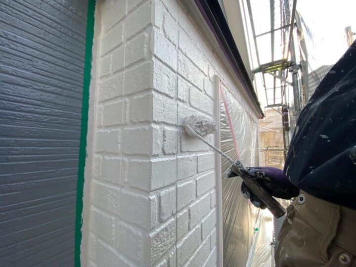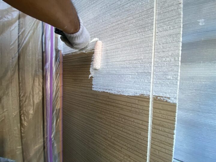 外壁に下塗りをしています。上からの塗料をしっかり密着させるために、下地をしっかり調整していきます。外壁 上塗り(クリヤー)