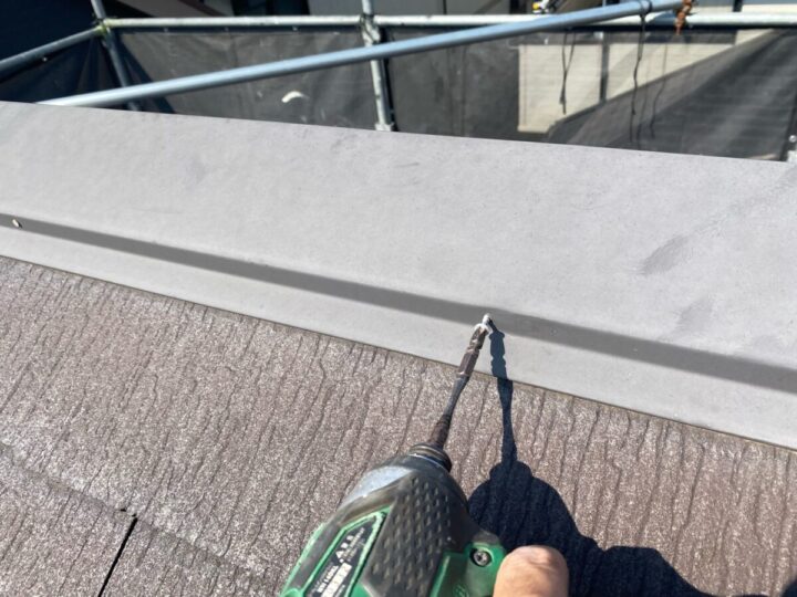 浮き出てしまった古いビスを取り外します。棟板金 ビス交換