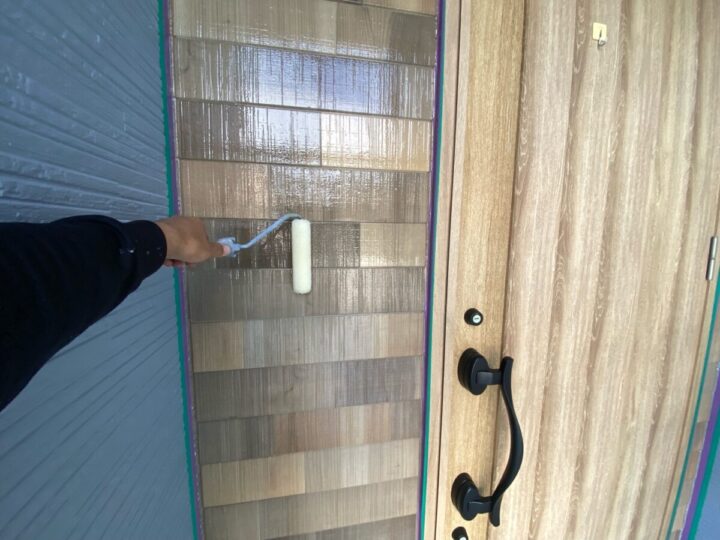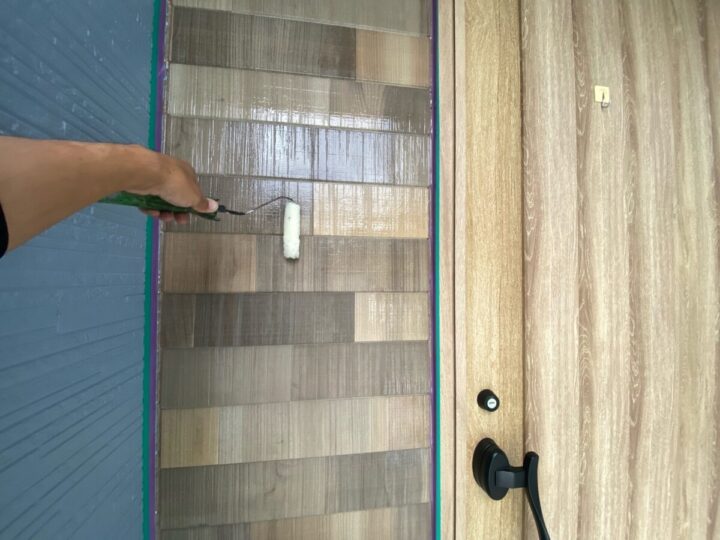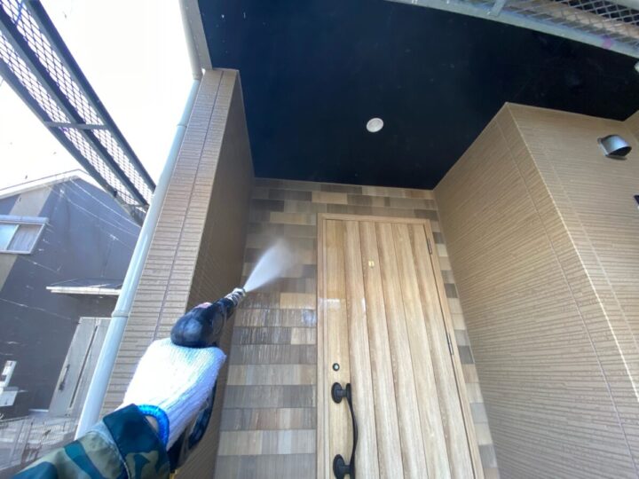 付着した雨跡・コケ・カビなどの汚れをきれいに洗い流します。汚れたままだと良い塗料を塗っても、すぐに浮いてきたり剥がれたりの原因になるからです。玄関扉 高圧洗浄