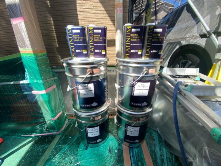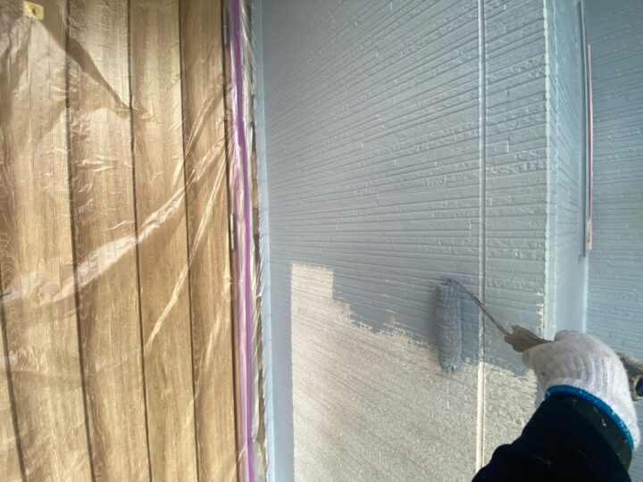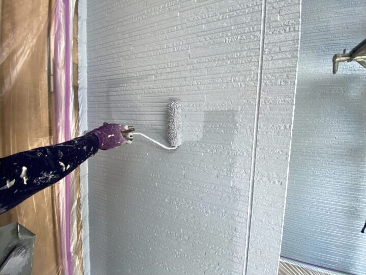 外壁に下塗りをしています。上からの塗料をしっかり密着させるために、下地をしっかり調整していきます。外壁 中塗り(ブルーグレイ)