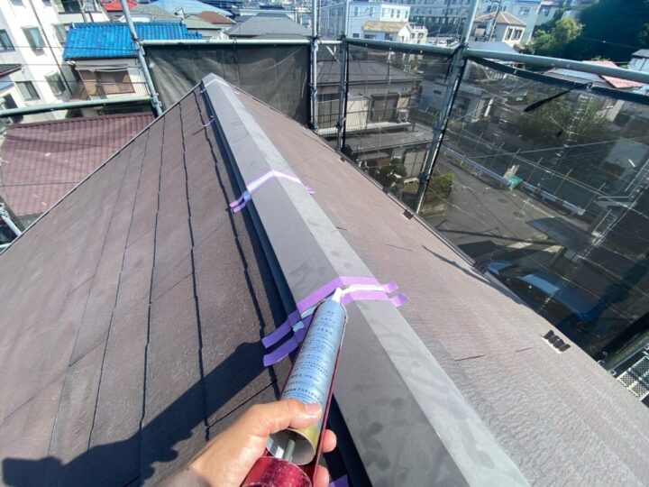 新しいコーキングを打ち込みます。棟板金 シーリング打設