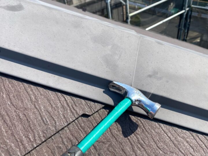 タスペーサーを取り付けることで、屋根の重なり部分に隙間を設けることができ、水捌けをよくして雨漏りのリスクをなくします。棟板金 ビス交換