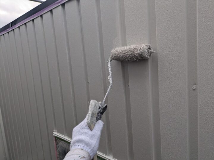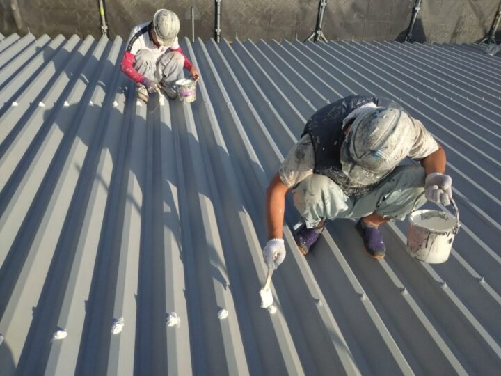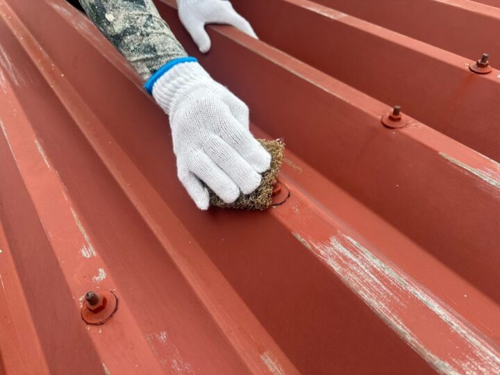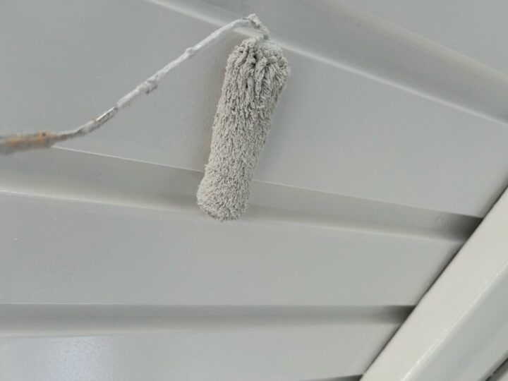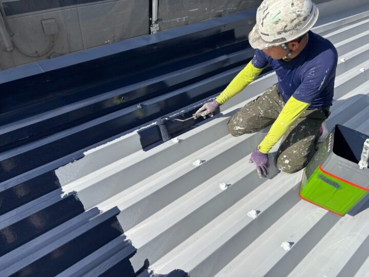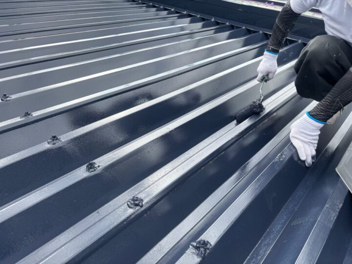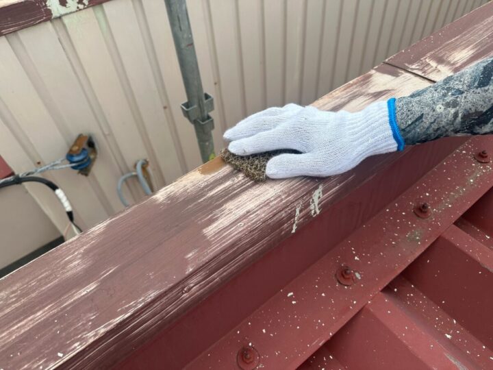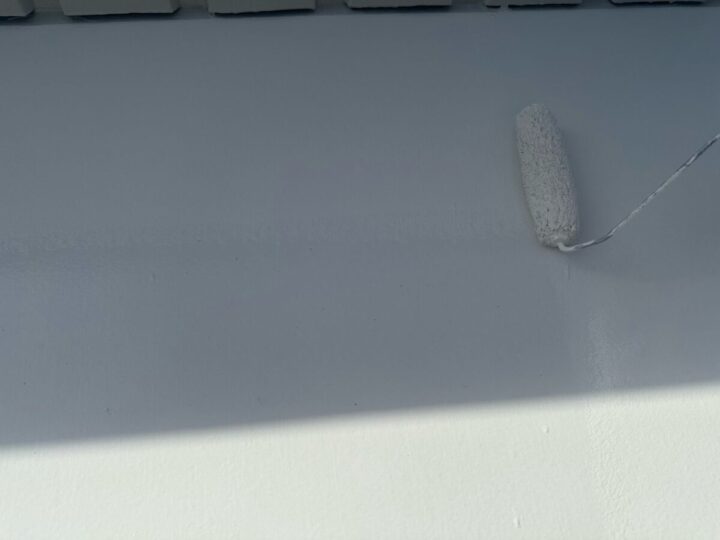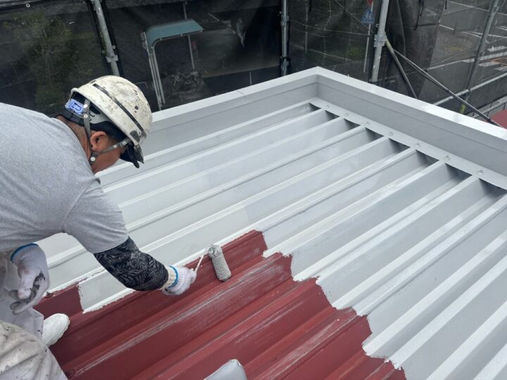 屋根に下塗りをしています。上からの塗料をしっかり密着させるために、下地をしっかり調整していきます。