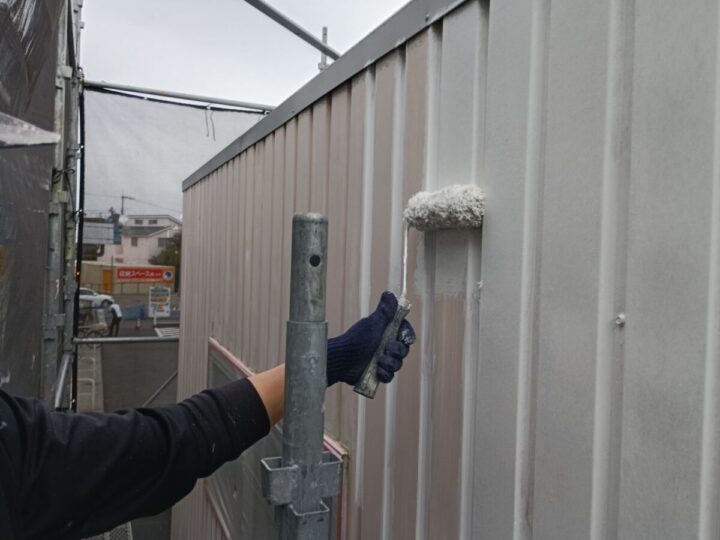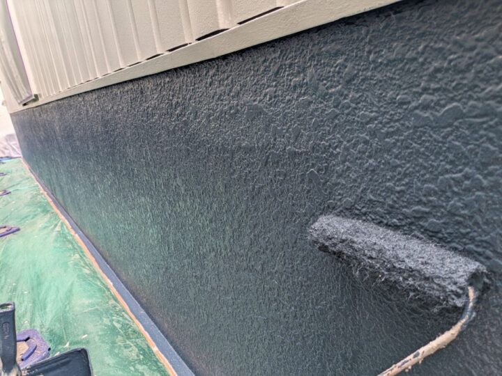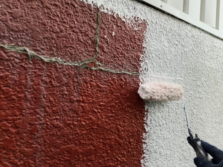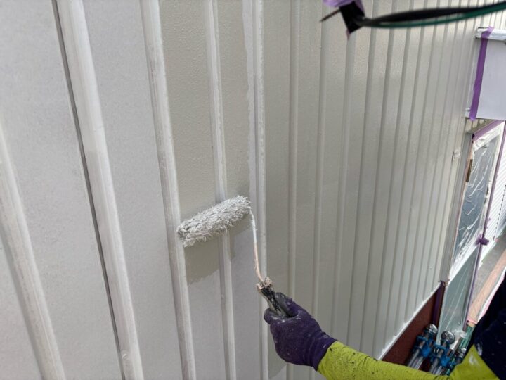 外壁に下塗りをしています。上からの塗料をしっかり密着させるために、下地をしっかり調整していきます。