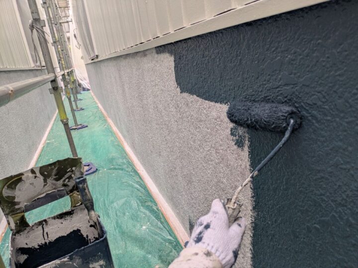 中塗りに使用した塗料で、上塗りを行います。2回塗ることで適切な膜厚を確保します。