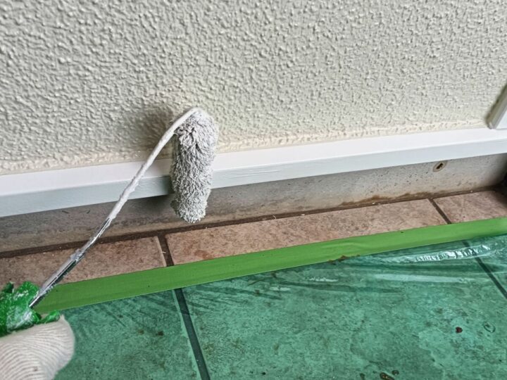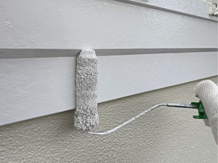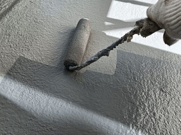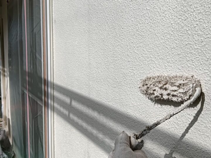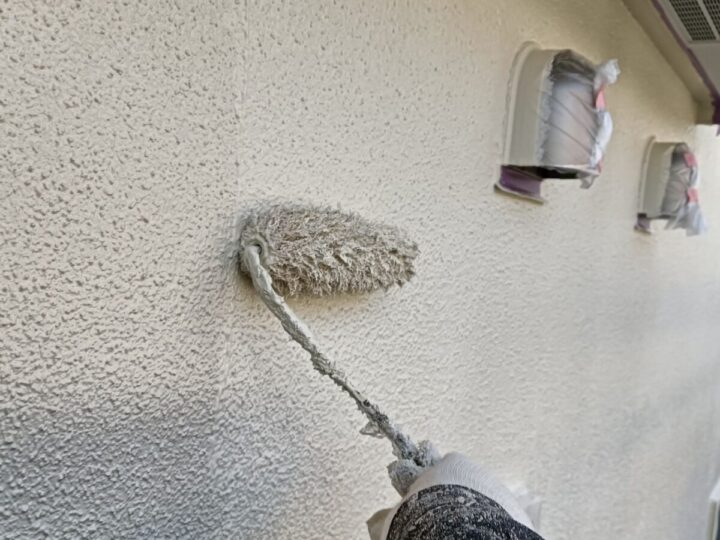 外壁に下塗りをしています。上からの塗料をしっかり密着させるために、下地をしっかり調整していきます。