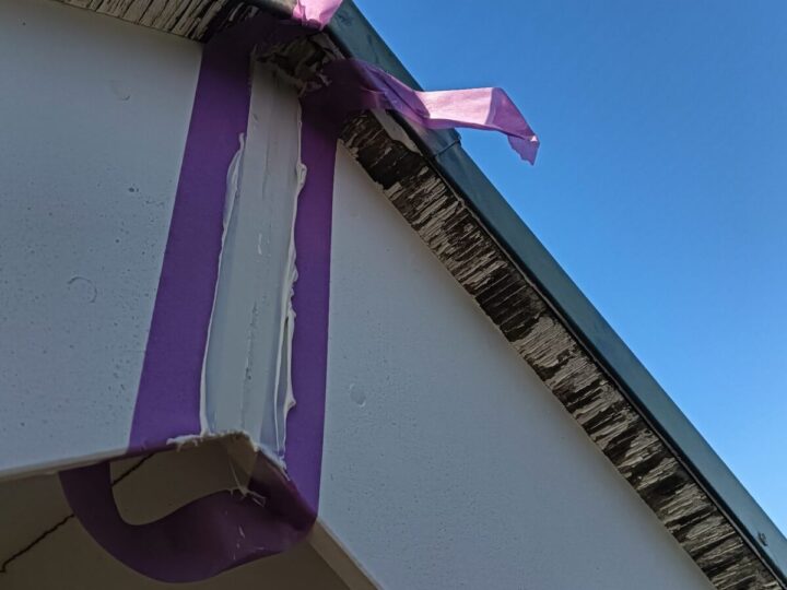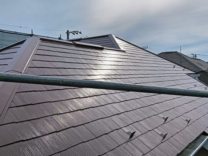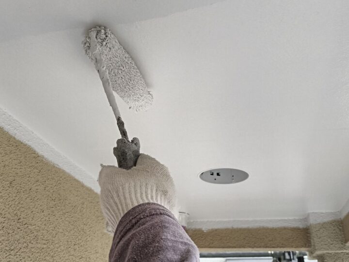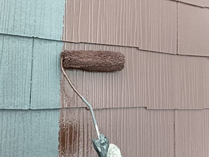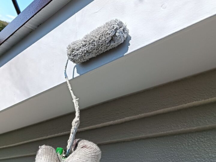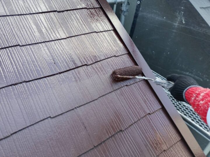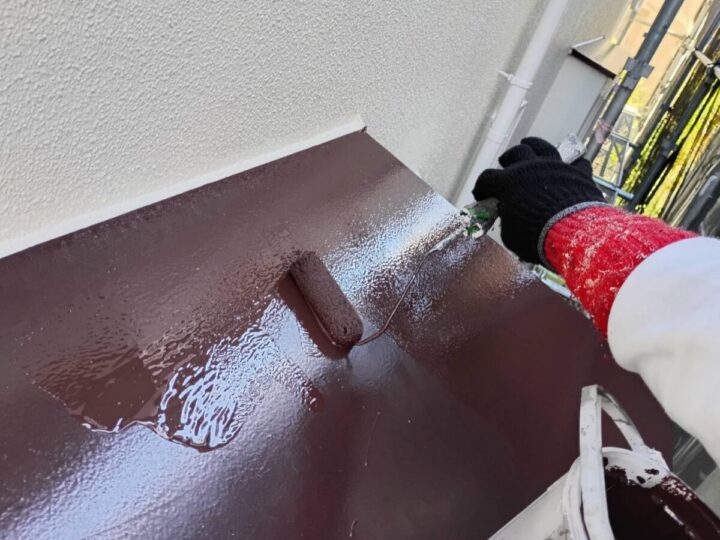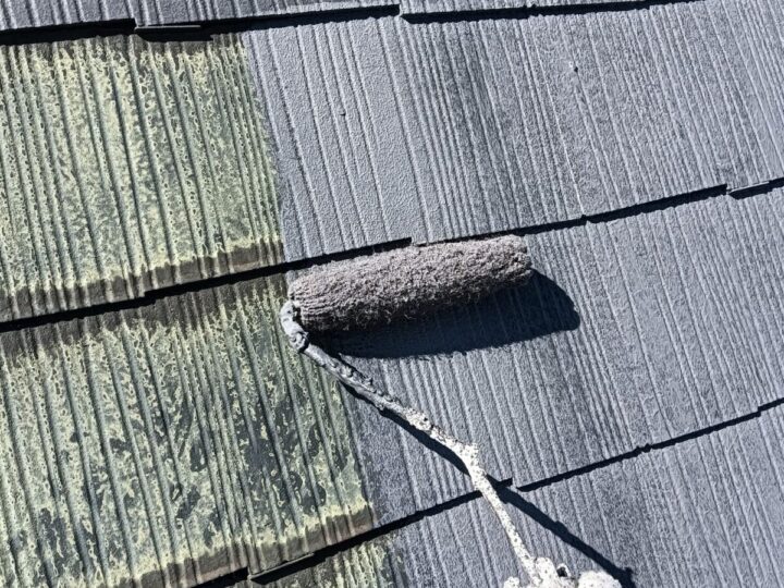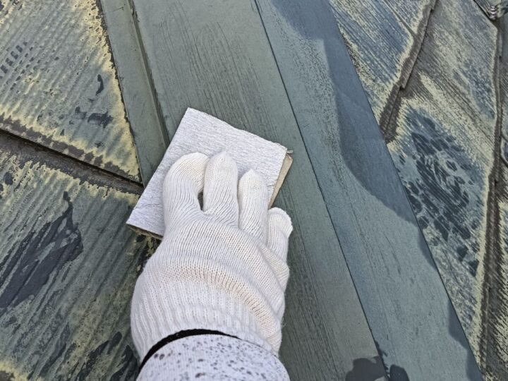 屋根に下塗りをしています。上からの塗料をしっかり密着させるために、下地をしっかり調整していきます。