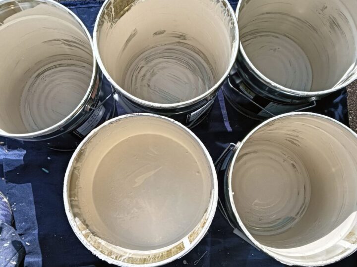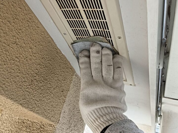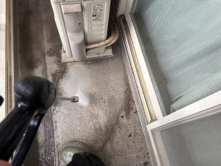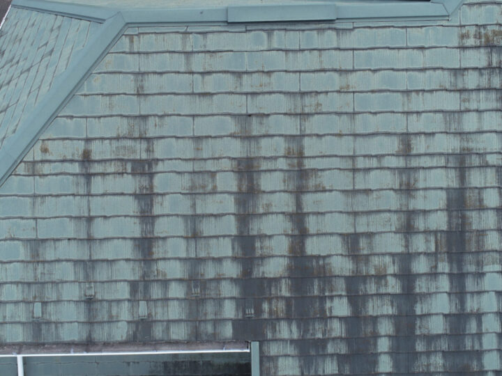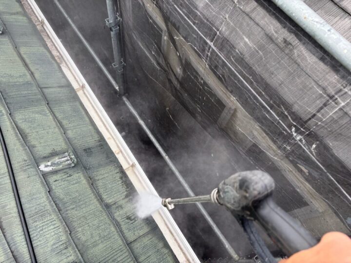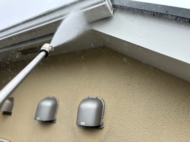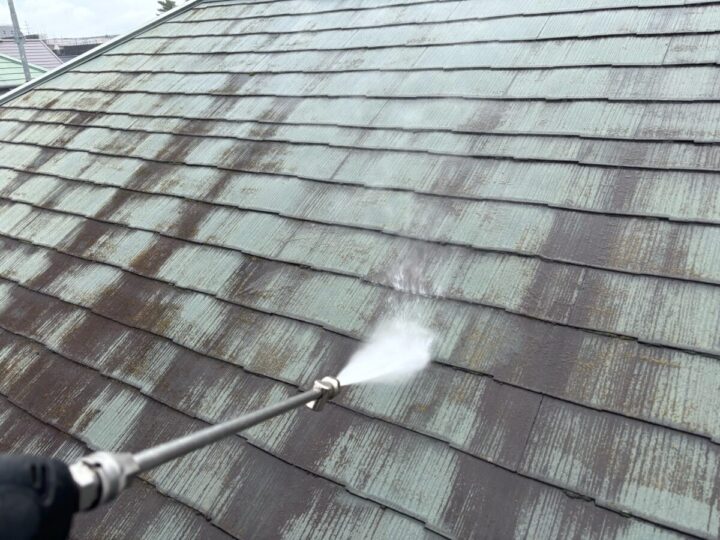 付着した雨跡・コケ・カビなどの汚れをきれいに洗い流します。汚れたままだと良い塗料を塗っても、すぐに浮いてきたり剥がれたりの原因になるからです。