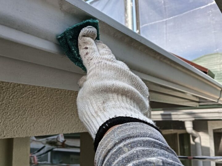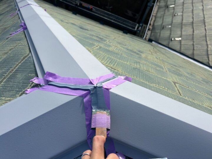 棟板金に錆止めの下塗りをしています。上からの塗料をしっかり密着させるために、下地をしっかり調整していきます。
