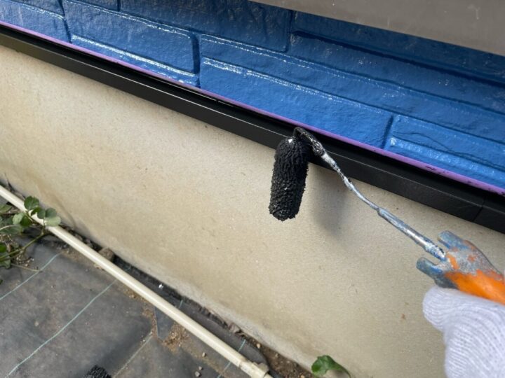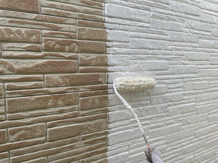 外壁に下塗りをしています。上からの塗料をしっかり密着させるために、下地をしっかり調整していきます。