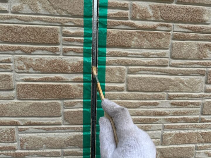 劣化していた外壁の目地コーキング(シーリング)を撤去後、新しいコーキング材をしっかり密着するために接着剤の役割をしてくれるプライマーを刷毛で塗り込んでいきます。