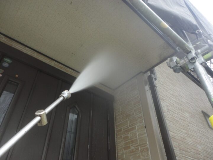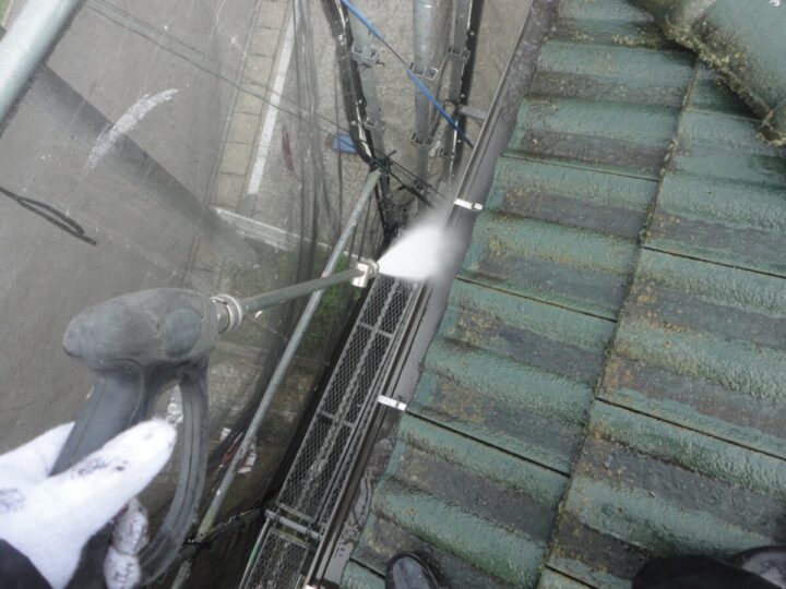 付着した雨跡・コケ・カビなどの汚れをきれいに洗い流します。汚れたままだと良い塗料を塗っても、すぐに浮いてきたり剥がれたりの原因になるからです。